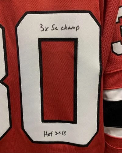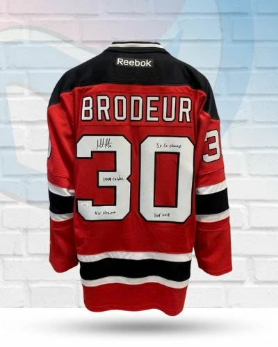 This Martin Brodeur New Jersey Devils autographed Reebok home jersey with inscriptions is the perfect addition to your fan cave or game day wardrobe. Martin Brodeur personally hand-signed this jersey during a private autograph signing. Fan Cave guarantees this autograph with a Certificate of Authenticity and tamper resistant hologram from James Spence Authentication. Whether you’re looking to add to your personal collection or seeking the best gift, the Martin Brodeur New Jersey Devils autographed Reebok home jersey is a great choice!
