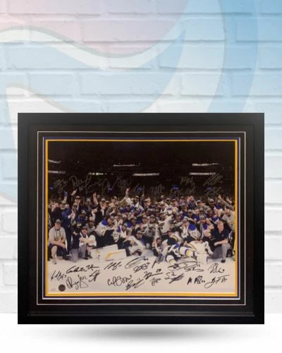 This St Louis Blues 2019 Stanley Cup On Ice Team Autographed Framed 16×20 is the perfect addition to your fan cave. Each player signed this photo at our retail location in the St Louis Premium Outlet during public and private autograph signings. Whether you’re looking to add to your personal collection or seeking the best gift, the St Louis Blues 2019 Stanley Cup On Ice Team Autographed Framed 16×20 is a great choice!Â