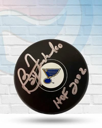 This Bernie Federko St Louis Blues autographed logo puck with inscription is the perfect addition to your fan cave. Bernie Federko personally hand-signed this puck during an autograph signing. Bernie also inscribed “HOF 2002”. Fan Cave guarantees this autograph with a Certificate of Authenticity and tamper resistant hologram from Fan Cave Sports. Whether you’re looking to add to your personal collection or seeking the best gift, the Bernie Federko St Louis Blues autographed logo puck with inscription is a great choice!Â