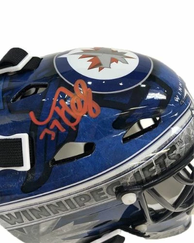 This Connor Hellebuyck Winnipeg Jets autographed mini goalie mask is the perfect addition to your fan cave. Connor Hellebuyck personally hand-signed this mask during a private autograph signing. Fan Cave guarantees this autograph with a Certificate of Authenticity and tamper resistant hologram from Fan Cave Sports. Whether you’re looking to add to your personal collection or seeking the best gift, the Connor Hellebuyck autographed mini goalie mask is a great choice!Â