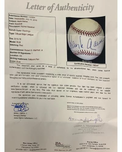 This Hank Aaron Atlanta Braves autographed Baseball is the perfect addition to your fan cave. Hank Aaron personally hand-signed this baseball. Fan Cave guarantees this autograph with a Full Letter Certificate of Authenticity and tamper resistant hologram from James Spence Authentication. Whether you’re looking to add to your personal collection or seeking the best gift, the Hank Aaron Atlanta Braves autographed Baseball is a great choice!Â