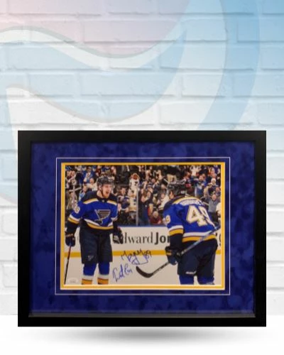 This Ivan Barbashev and Pavel Buchnevich St Louis Blues dual autographed framed 11×14 is the perfect addition to your fan cave. Ivan and Pavel signed this photo during private autograph signings. Whether you’re looking to add to your personal collection or seeking the best gift, this Ivan Barbashev and Pavel Buchnevich St Louis Blues dual autographed framed 11×14 is a great choice!Â