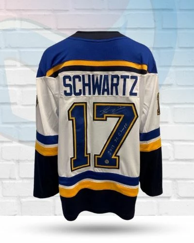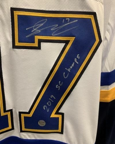 This Jaden Schwartz St Louis Blues autographed Fanatics away jersey is the perfect addition to your fan cave or game day wardrobe. Jaden Schwartz personally hand-signed this jersey during a private autograph signing. Jaden also inscribed “2019 SC Champs”. Fan Cave guarantees this autograph with a Certificate of Authenticity and tamper resistant hologram from Fan Cave Sports. Whether you’re looking to add to your personal collection or seeking the best gift, the Jaden Schwartz St Louis Blues autographed Fanatics away jersey is a great choice!Â