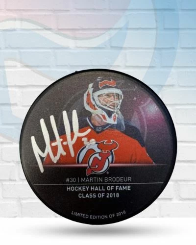 This Martin Brodeur New Jersey Devils autographed 2018 HOF limited edition puck is the perfect addition to your fan cave. Martin Brodeur personally hand-signed this puck during a private autograph signing. Fan Cave guarantees this autograph with a Certificate of Authenticity and tamper resistant hologram from James Spence Authentication. Whether you’re looking to add to your personal collection or seeking the best gift, the Martin Brodeur New Jersey Devils autographed 2018 HOF limited edition game puck is a great choice!Â