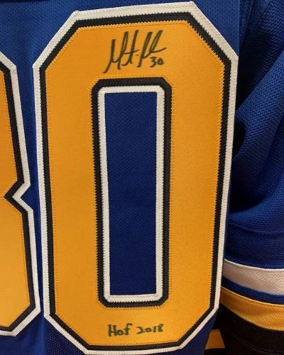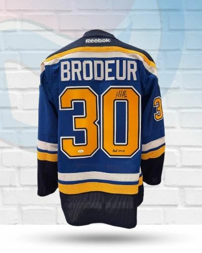 This Martin Brodeur St Louis Blues autographed Reebok home jersey with inscription is the perfect addition to your fan cave or game day wardrobe. Martin Brodeur personally hand-signed this jersey during a private autograph signing. Fan Cave guarantees this autograph with a Certificate of Authenticity and tamper resistant hologram from James Spence Authentication. Whether you’re looking to add to your personal collection or seeking the best gift, the Martin Brodeur St Louis Blues autographed Reebok home jersey is a great choice!Â
