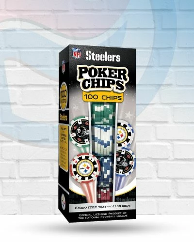 These Pittsburgh Steelers poker chips are the perfect choice for all NFL Football fans! Set contains 100 casino-style chips in a black tray. These poker chips are perfect for Texas Hold’em, Blackjack, tournaments, card clubs, and more! Each standard-colored poker chip features two team designs. Support your favorite NFL Team with officially licensed and approved poker chips. Perfect for all fans!