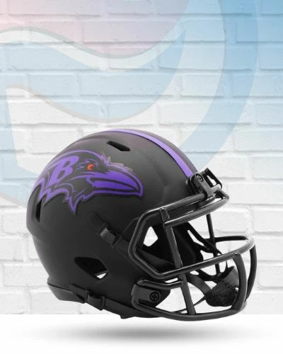 Baltimore Ravens Eclipse Riddell Speed Mini Replica NFL Football Helmet. Whether you’re using it to display your Ravens pride or collect your favorite players’ autographs, this Baltimore Ravens Eclipse Speed Mini Helmet is the perfect addition to your Ravens collection! The most popular collectible in Riddell’s history, your new Ravens helmet is great for displaying in your home or office and makes the perfect gift for the true sports fan. The Eclipse helmet is decorated with official alternate team decals on each side and stripe down the middle. This mini helmet is a matte black ABS plastic speed shell design with Z2B clear coated black face mask, black foam interior padding and 4 point black chinstrap just like a full size helmet.