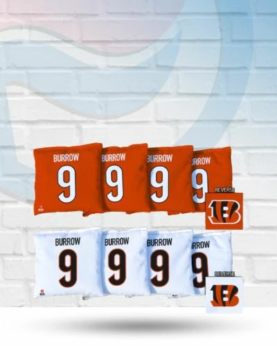 Upgrade from solid colors to this Joe Burrow Cincinnati Bengals Regulation Cornhole Bag Set! Each bag is hand filled with American sourced corn. The Joe Burrow Cincinnati Bengals Regulation Cornhole Bag Set is the perfect way to show off your team pride while you play your favorite game.Â