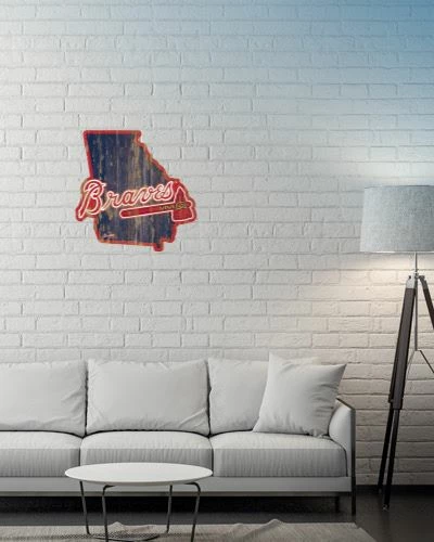 Display your team pride in your garage or fan cave with this Atlanta Braves State Shaped Wooden Sign. Its bold team graphics will have no one guessing who you cheer for. The Atlanta Braves State Shaped Wooden Sign is the perfect way to show your loyalty to the Braves.Â