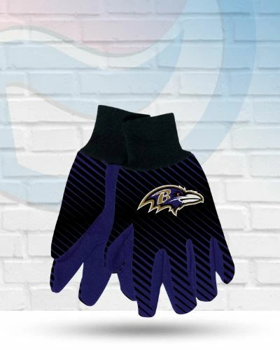 These Baltimore Ravens Two Tone Striped Utility Gloves feature the colors and logos of your favorite team. The pair is officially licensed and constructed of heavyweight cotton twill with rubber grips on the palms. Great for working in your yard while you listen to the game or throw a pair in the car for those cold drives home!
