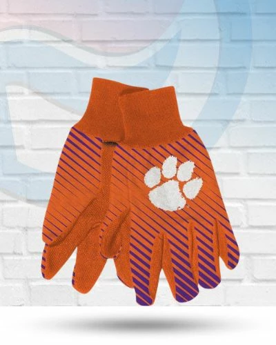 These Clemson tigers Two Tone Striped Utility Gloves feature the colors and logos of your favorite team. The pair is officially licensed and constructed of heavyweight cotton twill with rubber grips on the palms. Great for working in your yard while you listen to the game or throw a pair in the car for those cold drives home!