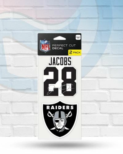 Show your team support with this Josh Jacobs Las Vegas Raiders set of two perfect cut decals. These decals can be placed on a variety of surfaces with their self-adhesive back. No one will question who your favorite team is when you display these Josh Jacobs Las Vegas Raiders set of two perfect cut decals.Â