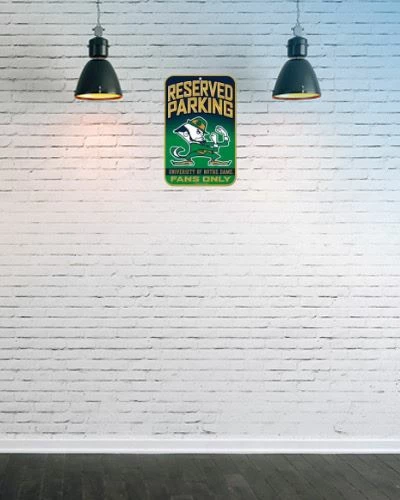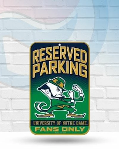 This Notre Dame Fighting Irish plastic reserve parking sign is the perfect item to hang and show off your team pride. Display it in your home, office or fan cave to show which team holds your loyalty. These signs work well as replacement to a poster because they are nearly indestructible in normal use, and can be washed with soap and water. The Notre Dame Fighting Irish plastic reserved parking sign is the perfect way to show your fandom.Â