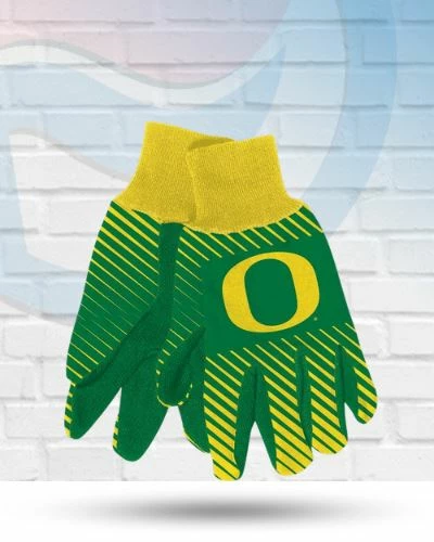These Oregon Ducks Two Tone Striped Utility Gloves feature the colors and logos of your favorite team. The pair is officially licensed and constructed of heavyweight cotton twill with rubber grips on the palms. Great for working in your yard while you listen to the game or throw a pair in the car for those cold drives home!