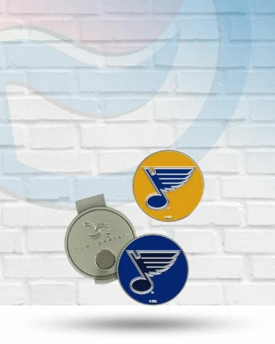 This St Louis Blues hat clip golf markers features two interchangeable iron stamped ball markers embellished with team trademark. This magnetic hat clip with ball markers attaches to a hat or visor. Perfect for your St Louis Blues Golf Bag also available at FanCave.com.